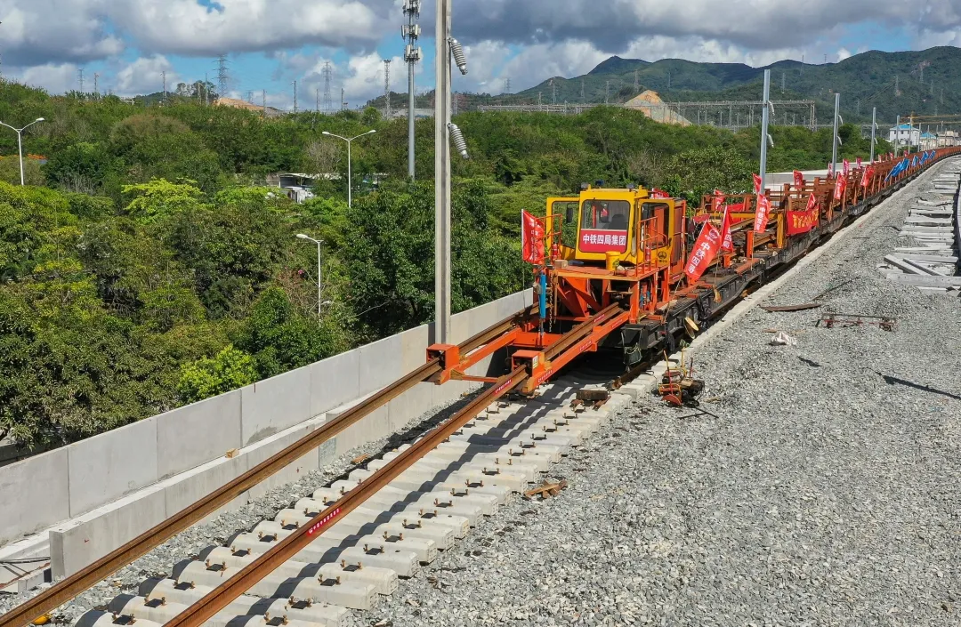 6月12日上午,随着最后一节500米长轨铺设完成,赣深高铁广东段与江西段成功接轨,这标志着赣深高铁全线正线轨道铺设完成,为年底顺利通车打下坚实基础。为全面提高铺轨作业效率,确保施工质量与节点工期,建设单位投入4组联合研发的铁路有砟、无砟轨道铺设一体式铺轨机组,这实现了有砟和无砟牵引模式的自由切换,能方便、快捷地完成区间线路和站内线路相结合的铺轨作业。