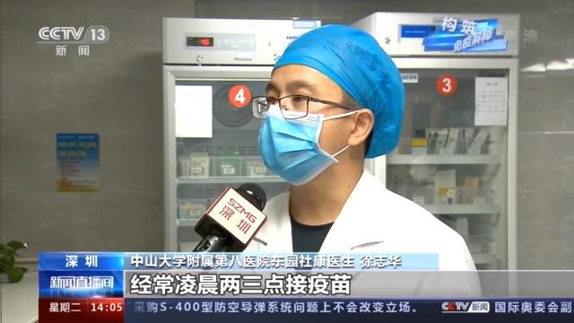 中山大学附属第八医院东园社康医生徐志华:(疫苗)随到随接,经常凌晨两三点接疫苗。运输疫苗的时候我们要核对温度,疫苗的批号、订单号,这些都签字,责任到人。