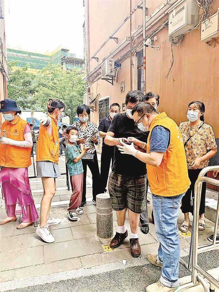 下沉干部来到社区后迅速投入战斗,在三十多摄氏度的高温下,穿着防护服,指引群众有序排队扫码登记,耐心细致地解答群众的疑问等。每天连续作战十多个小时,衣衫湿了又干,但依然干劲不减,夜以继日、耐心细致地做好老弱孕残等特殊群体的引导工作,用爱和温暖服务居民群众,用真心真情守护百姓健康。