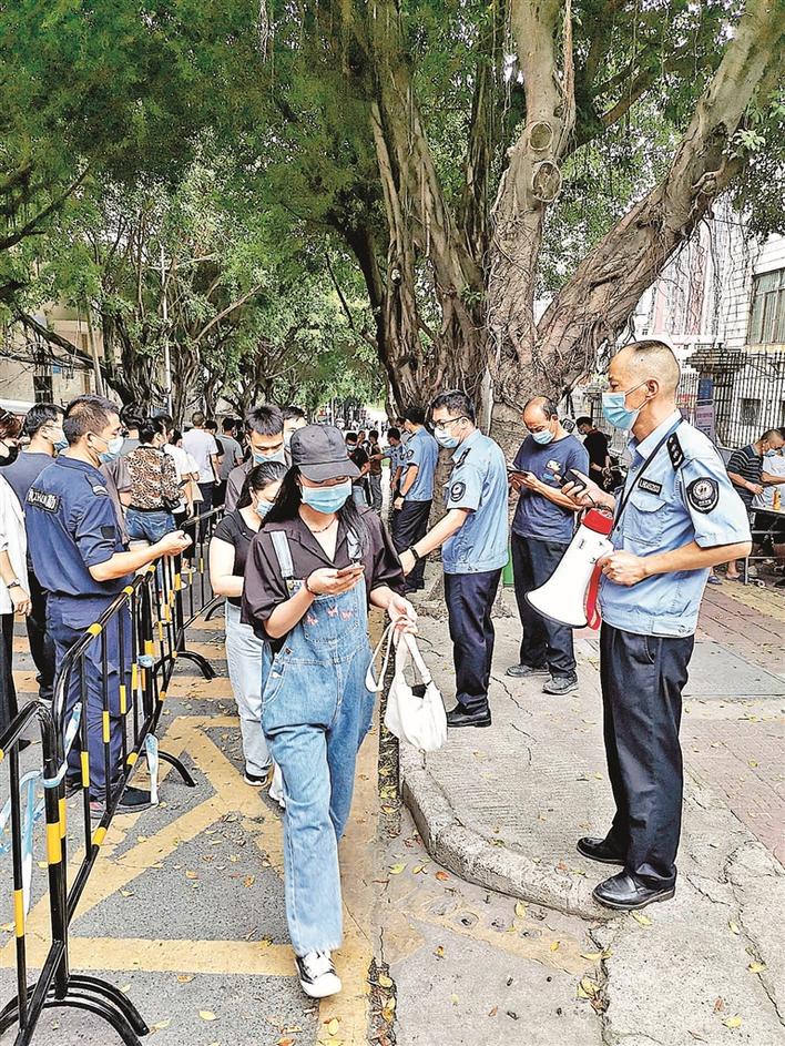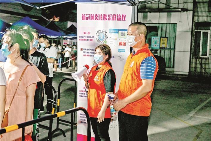 张建刚(右一)在核酸检测现场引导居民有序排队。