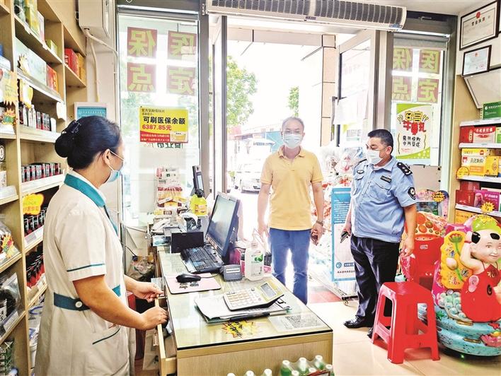 杨锦源(左二)巡查社区药店落实防疫情况。