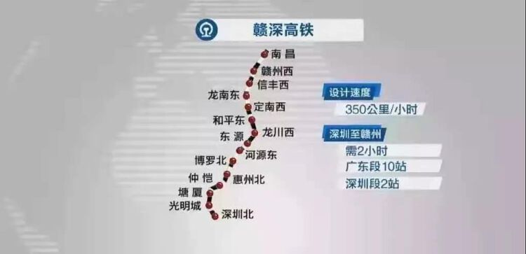 赣深高铁全长436.3公里,设计最高行车时速350公里,共设车站14座,其中广东段全长301.8公里。
