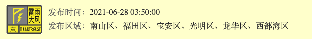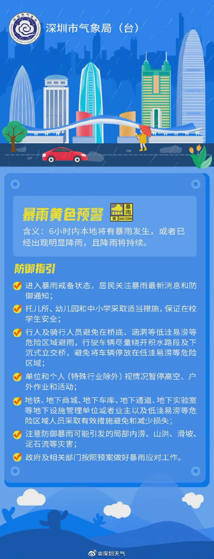 记者从深圳气象局了解到,目前分区暴雨橙色预警生效,发布地区为南山区、福田区、西部海区,出门注意防御。 早!新的一周从一场大雨开始,今天大概很多人和小编一样,在半夜被风雨声吵醒。 目前全市暴雨黄色预警和雷电预警生效中,南山区,福田区,宝安区,光明区、龙华区和西部海区,雷雨大风预警信号正在生效中。 全市保持暴雨戒备状态,大家出门记得带伞,出行注意防范。 今天是中考最后一天 预计早晨赴考时段 深圳市中东部地区有中到大雨 其余地区小到中雨 考生和家长们记得携带雨具 注意适当提前出发 雨天路滑注意交通安全 上班天气 预计早晨6-9时深圳市有雷阵雨,部分地区有大雨到暴雨,雨时伴有8级左右短时大风,气温25-29℃,相对湿度70%-90%,雨时能见度低于5公里,雨天路滑,大家要注意交通安全~ 来源:深圳天气