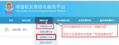 1.成功办结出口退(免)税备案后,可进入“增值税发票综合服务平台”的“退税勾选→发票退税勾选”及“退税确认勾选” 下(见下图),对用于出口退税的进项发票进行勾选。