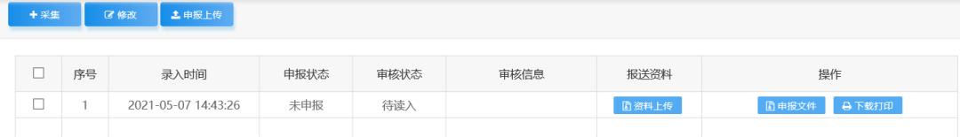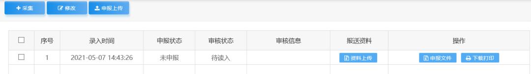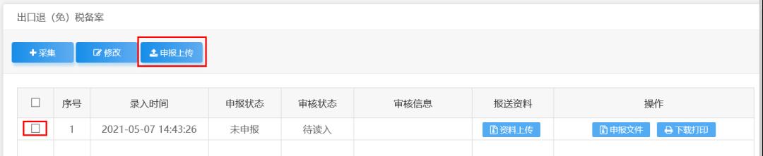 勾选申报文件点击“申报上传”(见下图),并及时查看审核状态、审核信息,直至成功发放。