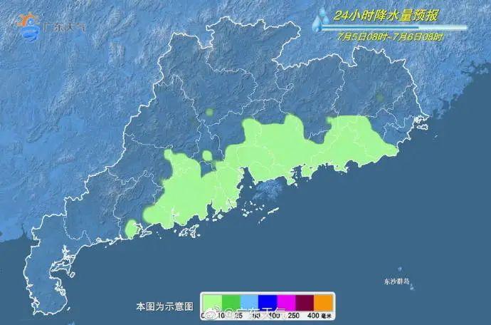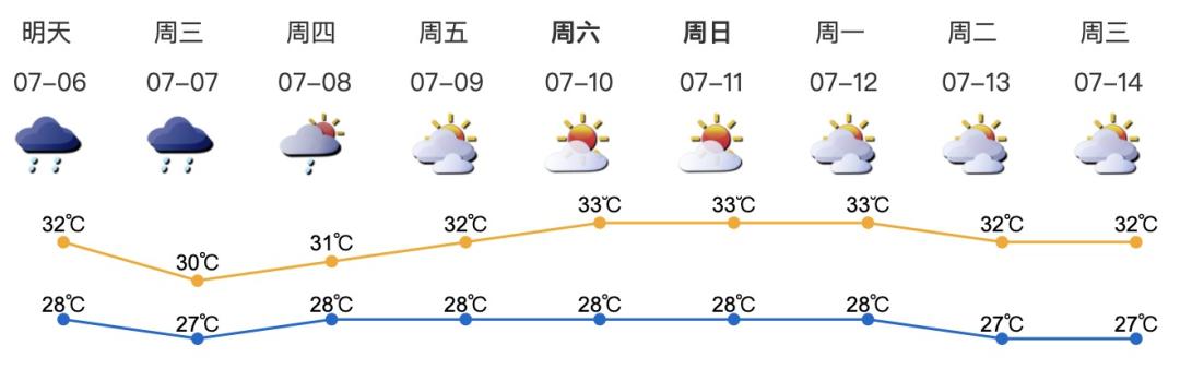 6-8日间歇性降雨渐趋频密,伴有分散雷暴,沿海、高地和海区有7级左右阵风;9-11日晴天到多云,天气炎热,局地有短时(雷)阵雨。深圳市气象台7月5日 10:11发布。