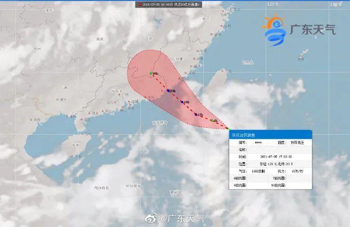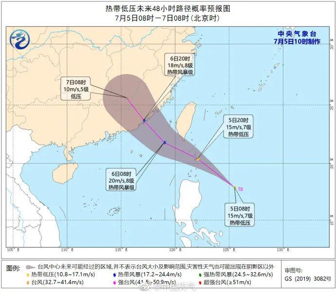 7月5日8时,菲律宾吕宋岛以东的热带扰动加强为热带低压(7级,15米/秒)。今日5时,其中心位于福建漳浦东南方大约405公里的海面上,就是北纬21.7度、东经120.6度,中心附近最大风力有7级(15米/秒),中心最低气压为1002百帕。