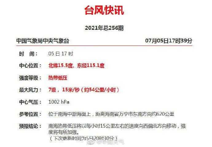 7月6日5时,其中心位于海南省万宁市东南方大约435公里的海面上,就是北纬15.8度、东经113.0度,中心附近最大风力有7级(15米/秒),中心最低气压为1002百帕。