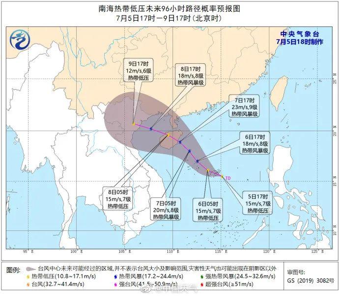 预计,该低压中心将以每小时15公里左右的速度向西北方向移动,强度逐渐加强,有可能于未来12-24小时发展为台风,并将于7日中午前后在海南岛东部一带沿海登陆(热带风暴级,8-9级,18-23米/秒)。