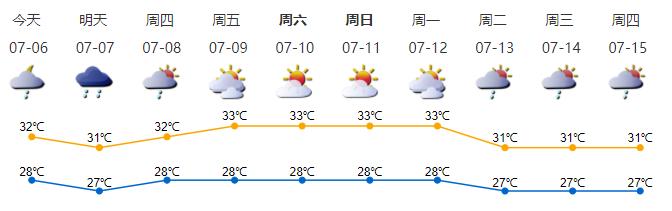 6日-7日多云,有雷阵雨,局部雨势较大,伴有7级左右短时大风;