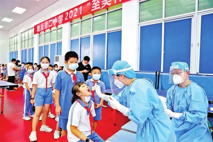医护人员为观澜二小的学生进行核酸采样。