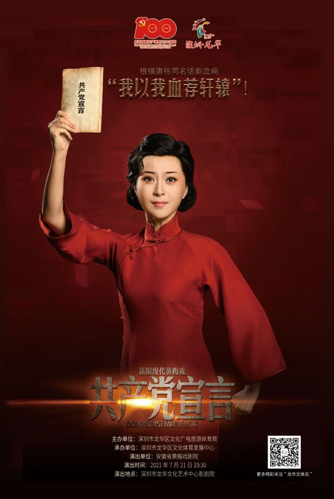 7月21日19:30龙华文化艺术中心影剧院一场荡气回肠的演出等您来鉴赏大型黄梅戏《共产党宣言》演出时间 2021年7月21日19:30演出地点 龙华文化艺术中心影剧院主办单位 深圳市龙华区文化广电旅游体育局承办单位 深圳市龙华区文化体育发展中心抢票方式 扫描下方二维码可抢票抢票时间 2021年7月15日20 00演出剧目介绍.大型黄梅戏舞台剧《共产党宣言》根据唐栋同名话剧改编,讲述了这样一个可歌可泣的故事 1927年,为反抗国民党反动派背叛国民革命的屠杀政策,中国共产党继南昌起义、湘赣起义后,又发动了广州起义。整场演出,演员们用精湛的演技塑造了一个个鲜活的人物形象,展现了一段震撼人心的历史和跌宕起伏的人物的命运,将革命先烈的精神和信仰传递给观众,同时还挖掘了一些让人感动的细节,展现人性的深度。重磅卡司,倾情演绎袁媛饰林雨霏国家一级演员,中宣部思想文化青年英才,曾在第七届中国戏剧“小梅花大赛”中荣获“金奖”,央视主办的“寻找七仙女”大赛中荣获“金奖”,2012首届全国黄梅戏广播大赛中荣获“一等奖”