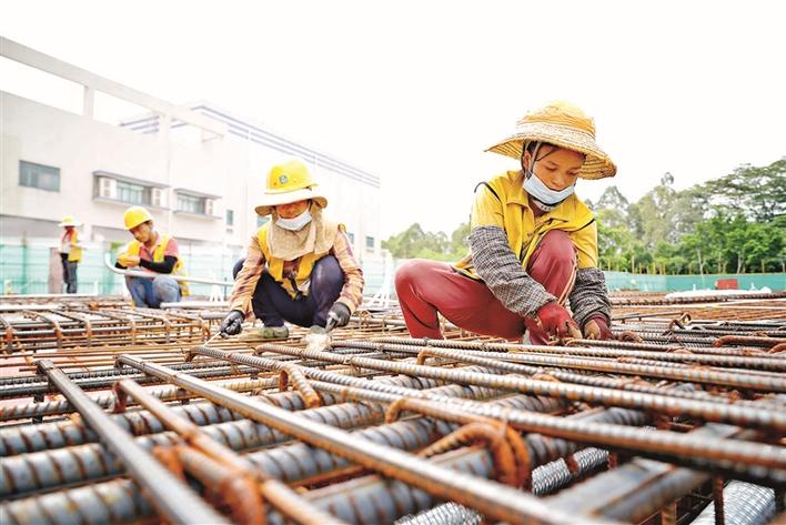 在龙华区职业技术学校项目建设工地,工人穿戴着防晒设备在紧张工作。