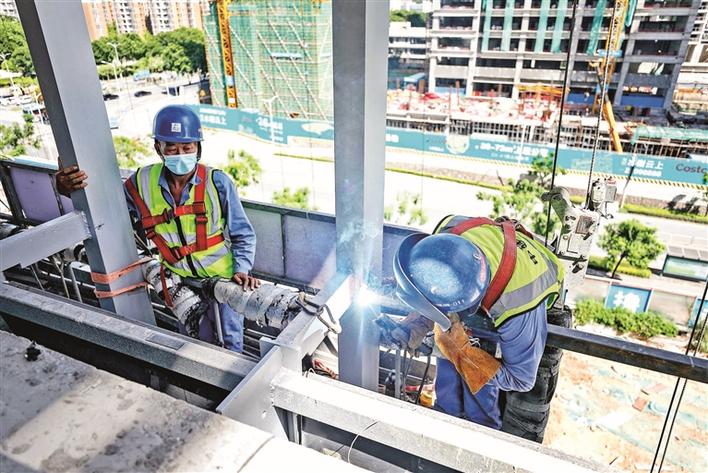 作为龙华区的综合文体设施,龙华文体中心集体育馆、青少年宫、足球场、游泳馆、空中花园为一体,因其设计方案具有艺术感和现代感,建设难度颇大,对施工作业人员的操作技术要求也很高。记者了解到,龙华文体中心是平铺式场馆建设,整个项目户外建筑部分都暴露在阳光之下,鲜少有阴凉避暑之处。户外作业多为立面幕墙安装以及屋顶铺设。“上午9点过后,室外的体感温度会达到四五十度,而在钢结构上作业,温度更高。11点钟后,钢结构表面温度约有六七十度左右。”承建单位华润置地相关负责人董豪杰介绍道。