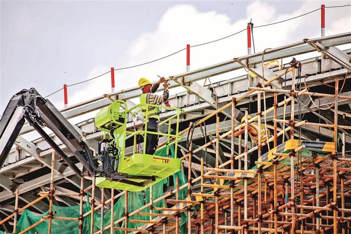 龙华文体中心项目工地,建筑工人在进行高空作业。