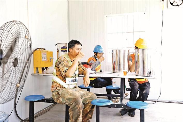 “为保证项目整体进度,项目组采取了提早上班、推迟下班、延长午休的方式来错开高温时段,确保工友们在酷暑季节安全作业。”顿凯介绍,工地现有工人340多人,户外作业时间为上午6时30分至10时30分,下午3时至6时30分。上午11时至下午3时禁止开展户外作业。