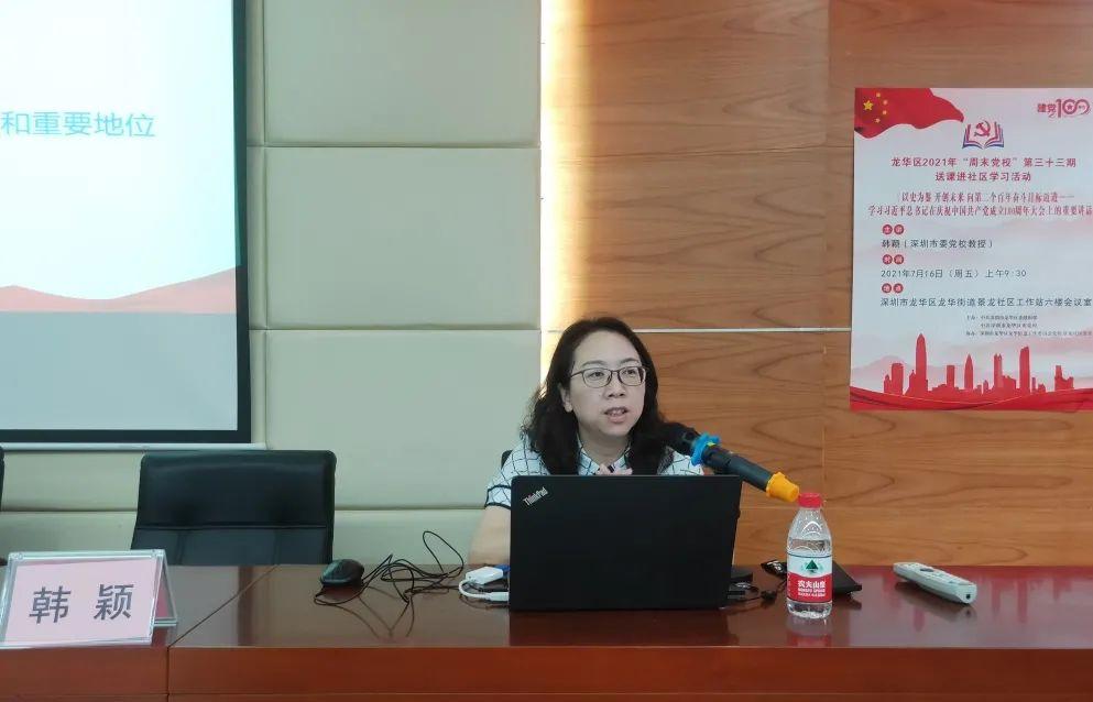 7月16日上午,龙华区2021年“周末党校”第三十三期送课进社区学习活动走进龙华街道景龙社区工作站,深圳市委党校教授韩颖作主题为《以史为鉴 开创未来 向第二个百年奋斗目标迈进——学习习近平总书记在庆祝中国共产党成立100周年大会上的重要讲话》讲座,来自龙华街道工作委员会党校 、景龙社区党委以及社区工作站的党员干部、群众等30余人参加了活动。