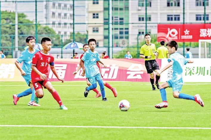 龙华小运动员(蓝色球服)在市运会足球比赛中奋力拼搏。