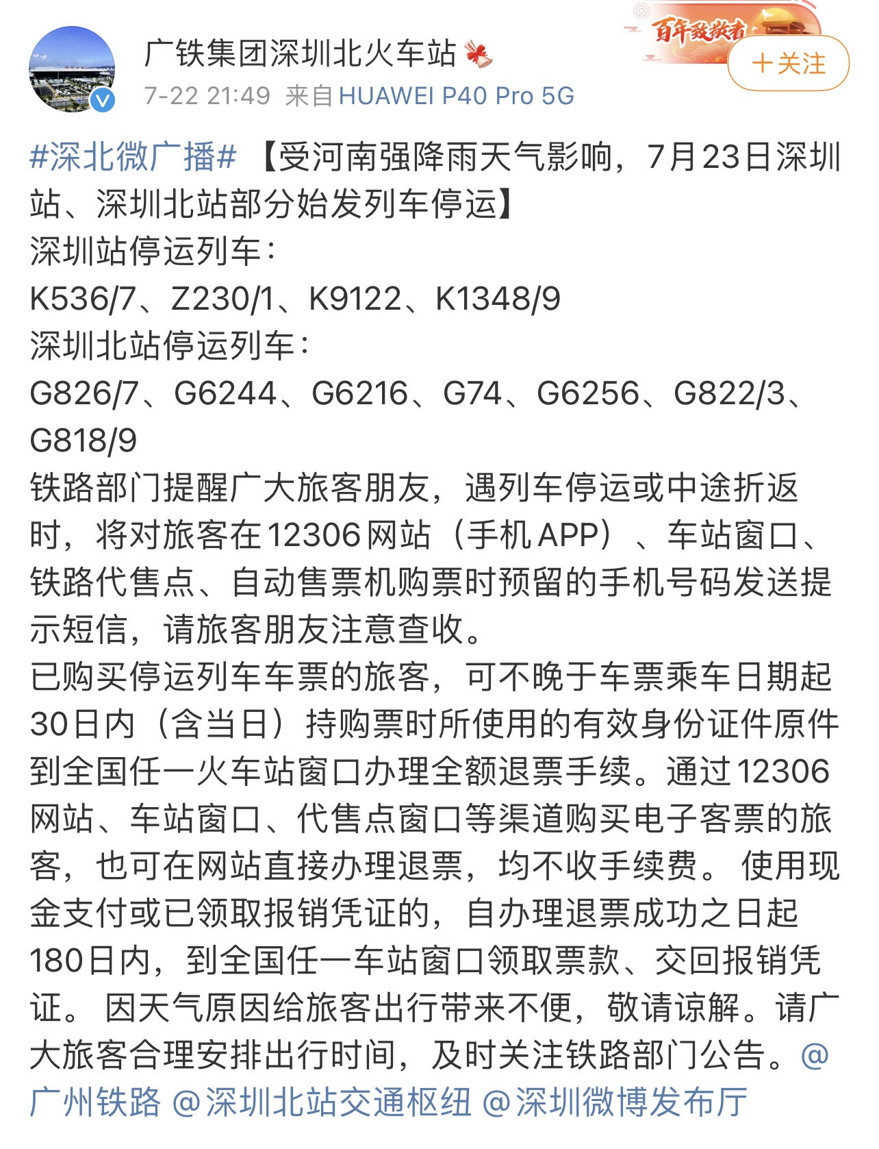 广铁集团7月22日晚发布消息称,受河南多地持续强降雨天气影响,7月23日深圳站、深圳北站部分始发列车停运。