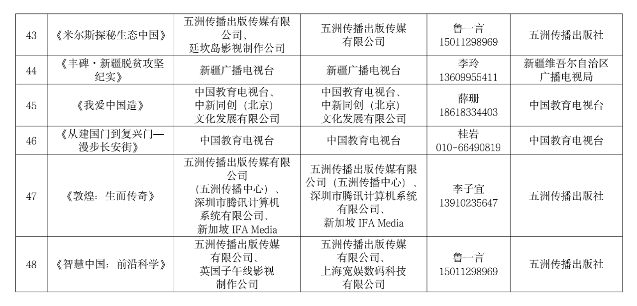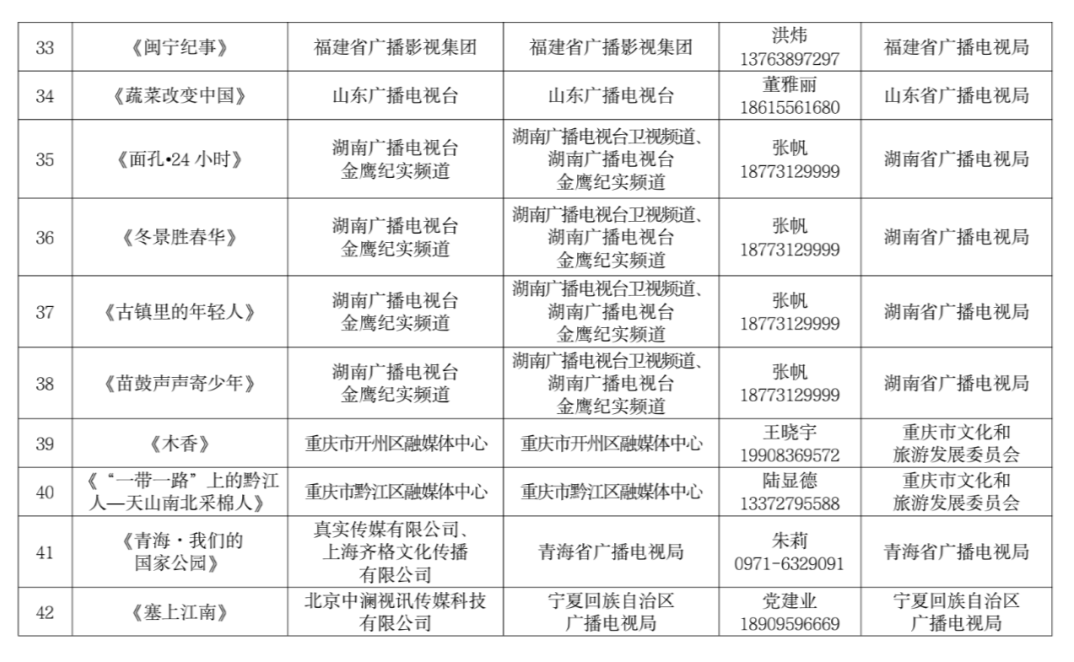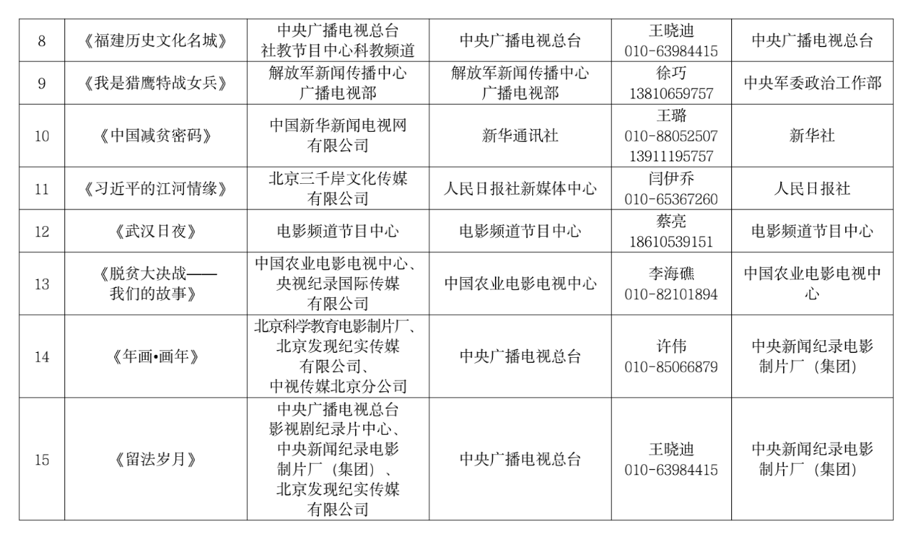 此外,《中国减贫密码》《留法岁月》《一级响应》《八月桂花遍地开》《闽宁纪事》《青海·我们的国家公园》《敦煌:生而传奇》等纪录片作品也入选在列。