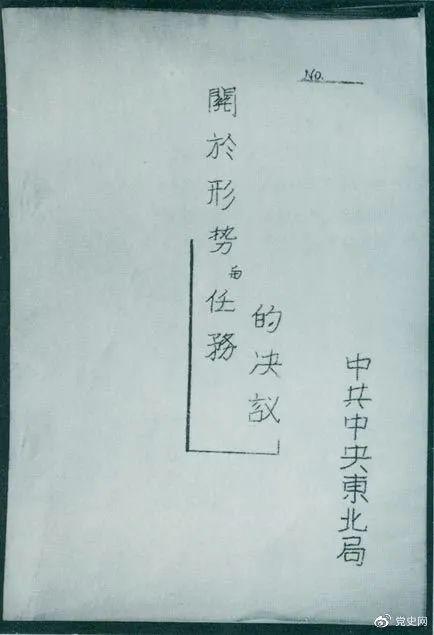 1946年7月,中共中央东北局通过了由陈云起草的《关于形势与任务的决议》,确立了创建根据地与进行长期艰苦战争的方针。该决议经中共中央修改和批准后,于8月12日正式发出。图为决议的翻印本。