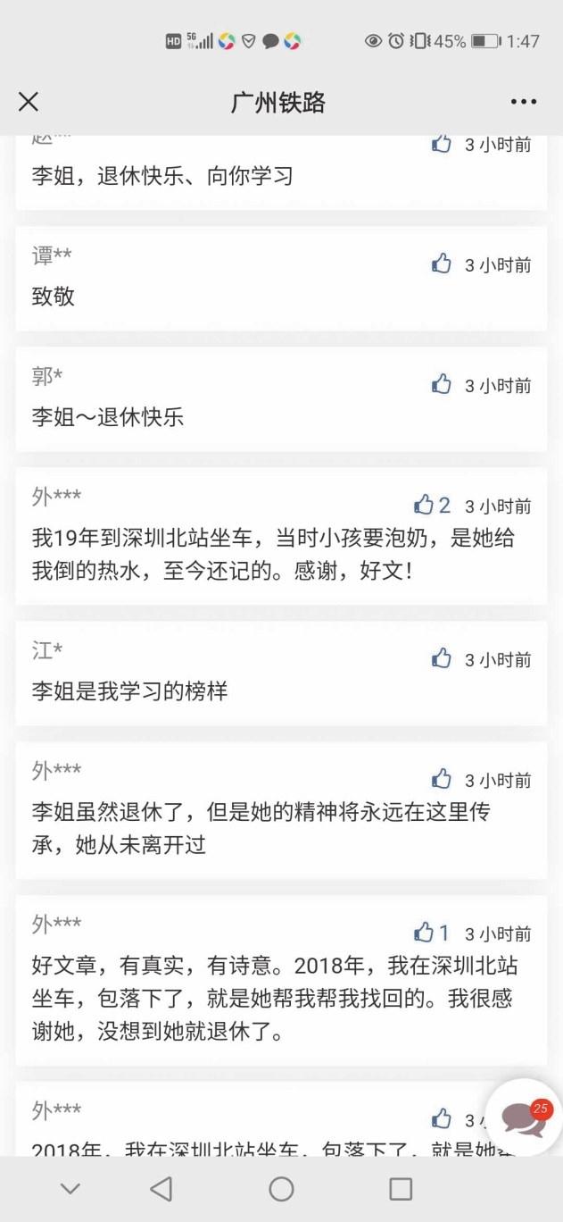 “我2019年到深圳北站坐车,当时小孩要泡奶,是她给我倒的热水,至今记得。感谢!”“2018年,我在深圳北站坐车,包落下了,就是她帮我找回的。我很感谢她,没想到她就退休了。”“六月底,在动车丢了一个背包,里边有贵重物品,感谢李姐帮我找回来。”“祝福兰姐以后人生一样精彩,永不言休,身体健康。”……深圳北站在线上发布了关于李贵兰退休的推文后,不少旅客前来留言,讲述在北站和“兰姐”的一面之缘、“兰姐”温暖伸出援手的故事。