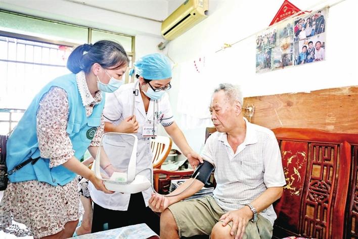 龙华街道区域社康中心的医护人员上门为老年人检查身体,评估健康状况。