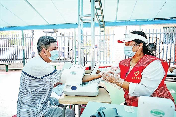 在区域社康中心,老年人接种疫苗前需测量血压。