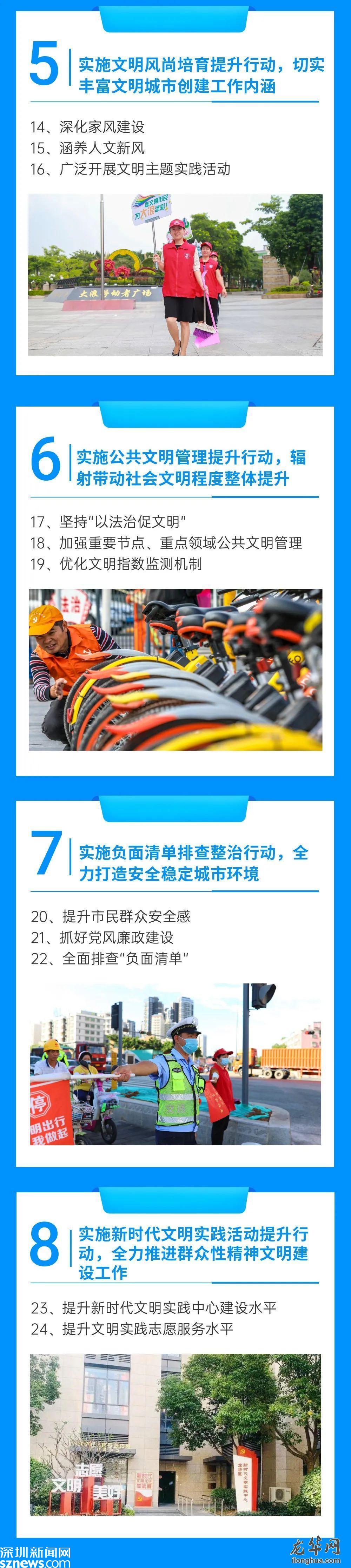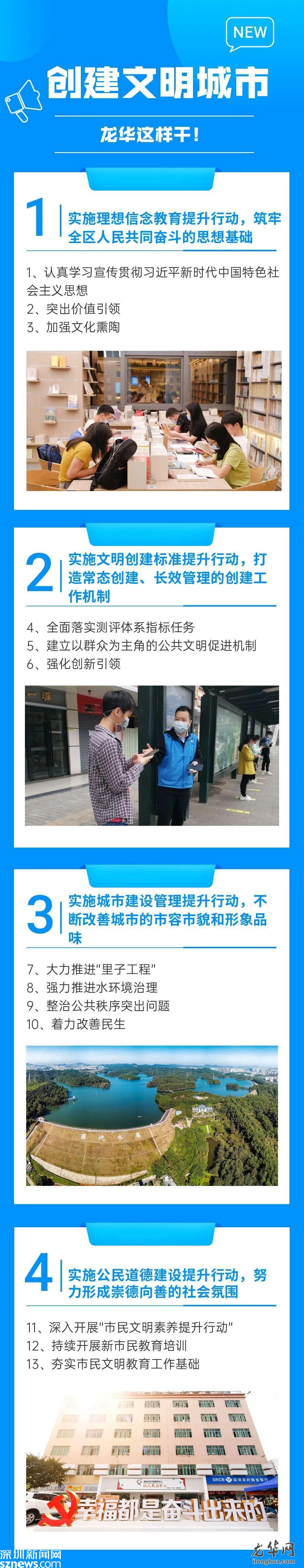 为进一步提升龙华区城市文明水平,全面推进龙华区全国文明城市创建工作再上新台阶,助力深圳连续荣膺“全国文明城市”,争创首届“全国文明典范城市”,打造文明城市典范样本,龙华区结合实际制定了《龙华区创建第七届全国文明城市工作实施方案(2021-2023)》。方案提出实施理想信念教育提升、文明创建标准提升、城市建设管理提升、公民道德建设提升、文明风尚培育提升、施公共文明管理提升、负面清单排查整治、新时代文明实践活动提升等八大行动。