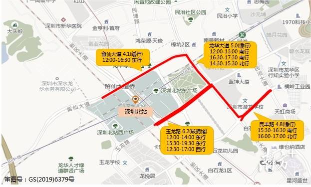 预计9月18日(假期前一天)深圳北站周边拥堵路段主要分布在龙华大道(民丰路-留仙大道,双向)、玉龙路(龙华大道-新区大道,双向)、民丰路(龙华大道-民治大道,双向)