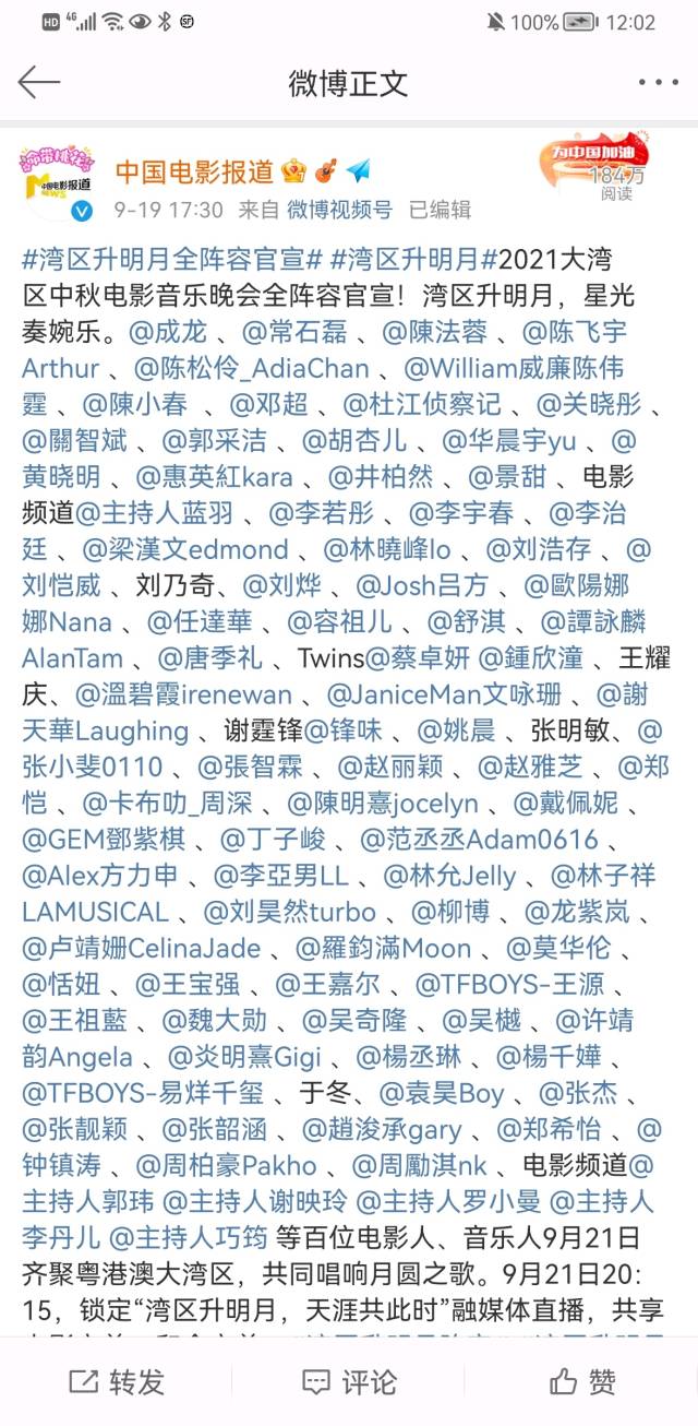 电影频道一直是中国电影人集结的第一平台。这次中秋电影歌会更是破纪录的集结了近200名电影人、音乐人汇聚一堂,为大湾区而歌。中秋之夜必将成为燃情之夜。