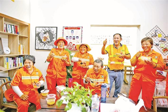 炎炎夏日,观澜辖区环卫工人在爱心驿站休息、消暑。
