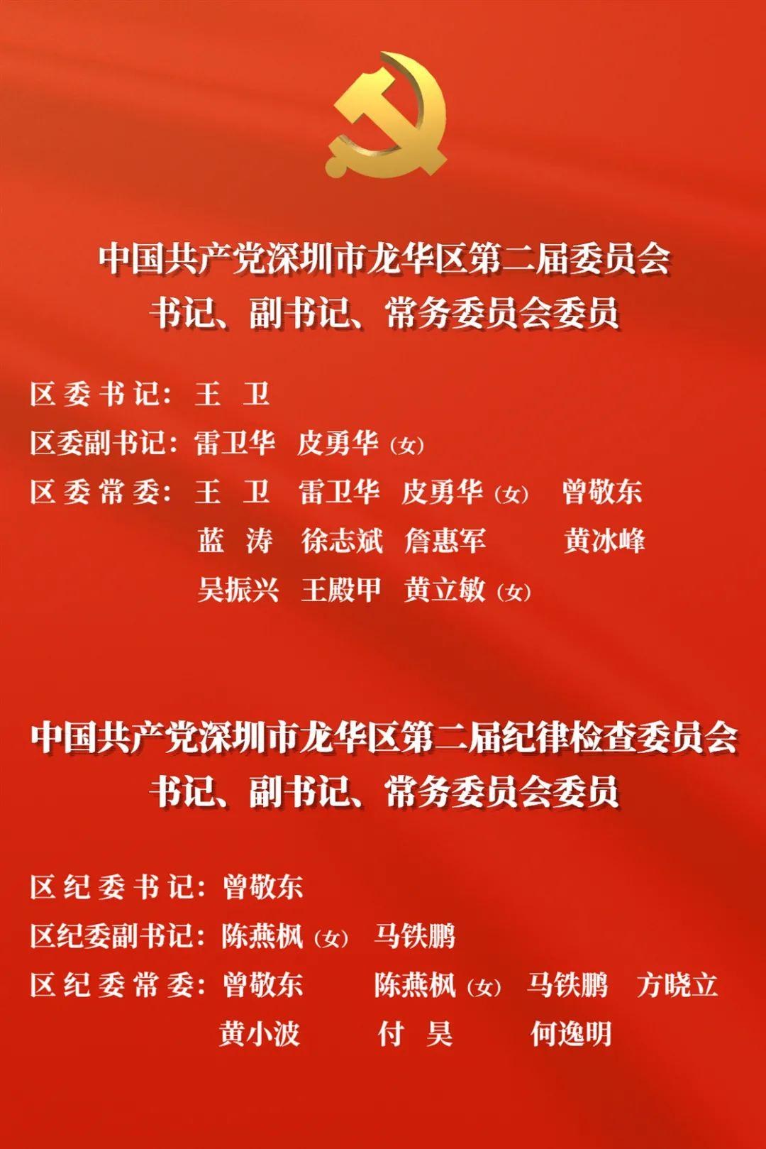 9月29日下午,中国共产党深圳市龙华区第二届委员会第一次全体会议举行。全会选举产生了新一届区委常委和书记、副书记。王卫、雷卫华、皮勇华、曾敬东、蓝涛、徐志斌、詹惠军、黄冰峰、吴振兴、王殿甲、黄立敏当选为区委常委,王卫当选为区委书记,雷卫华、皮勇华当选为区委副书记。