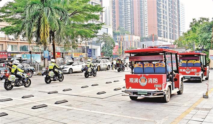 铁骑、警车、电动消防车闻令而动,有序驶出广场。