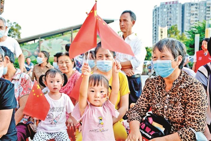社区居民带着孩子手举国旗观看表演庆祝国庆。
