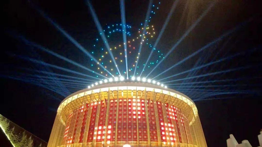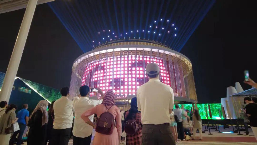 中国馆上空有150架无人机参与表演,配合馆外墙体灯光,以天空做画布,描绘出各种图案,吸引了大量观众。