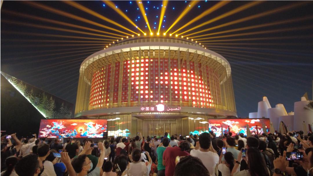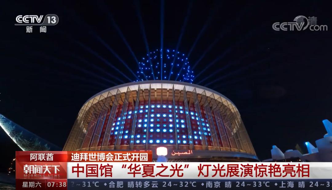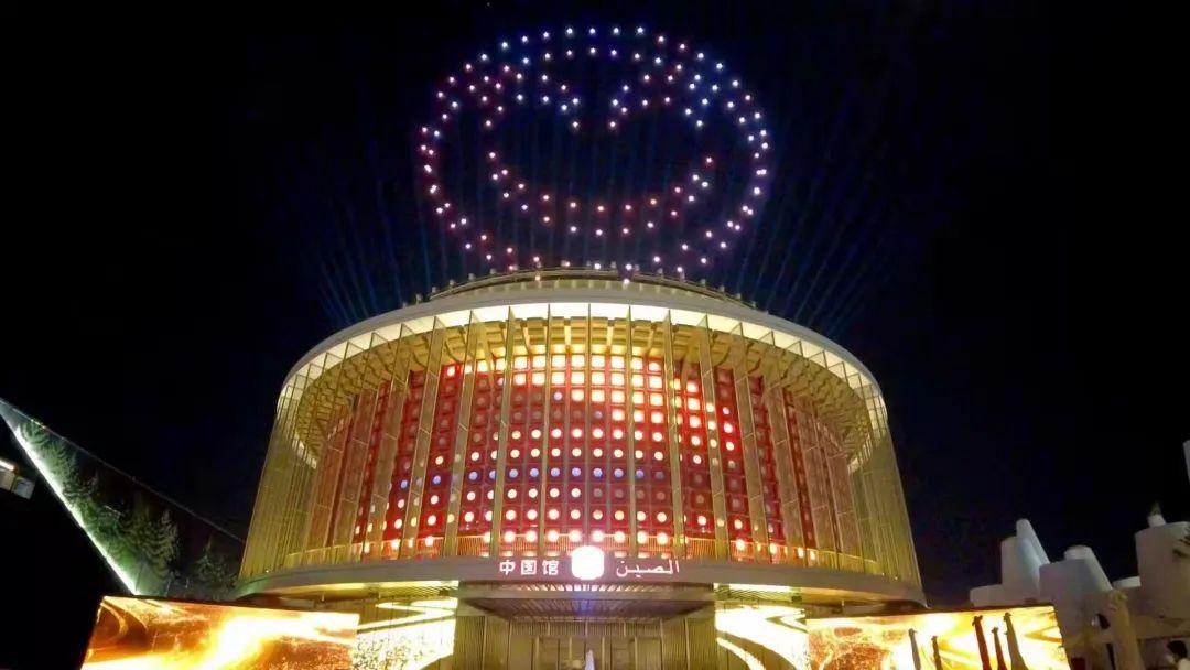 中国馆"华夏之光"灯光秀在9月23日-9月30日开始试运行,10月1日,迪拜世博会中国馆开馆"华夏之光"灯光秀展演正式上演。无人机灯光秀成为迪拜夜空中最璀璨的夜明珠,中国馆成为迪拜最亮丽的风景,大漠大以安全稳定完美的表演代表中国无人机企业展示中国文化与科技的融合魅力。