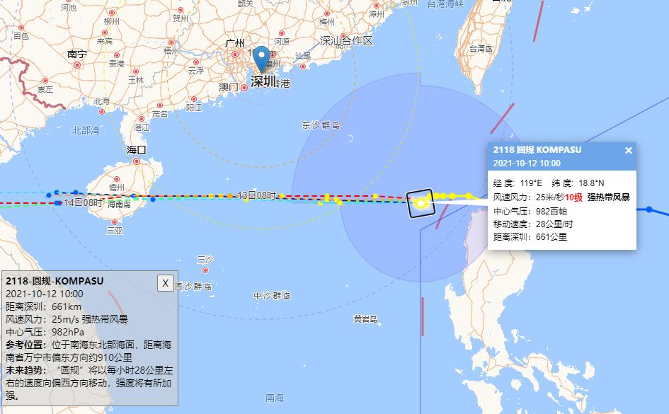 台风蓝色预警升级为黄色全市将进入台风防御状态深圳市台风蓝色预警升级为黄色深圳市气象台2021年10月12日11时30分将全市台风蓝色预警升级为黄色,预计受“圆规”影响,12-13日我市沿海、高地和海面最大阵风将达到11-13级。11日晚,市三防指挥部召开全体成员会议,全面研究部署防汛工作,要求全市各级、各部门、各单位各司其职,按照“防大汛、抗强台、抢大险、救大灾”的要求,提前做好台风防御准备工作。台风“圆规”已进入南海并将快速西行预计于13日凌晨从我市偏南方350-400公里的海面掠过“圆规”叠加冷空气影响其带来的大风强度强、持续时间长影响范围广将成为今年来大风影响最严重的台风防御指引深圳市分区风暴潮橙色预警市海洋监测预报中心于10月12日10时00分在深圳大鹏湾和大亚湾岸段发布风暴潮橙色预警,深汕特别合作区岸段发布风暴潮黄色预警,西部岸段发布风暴潮蓝色预警