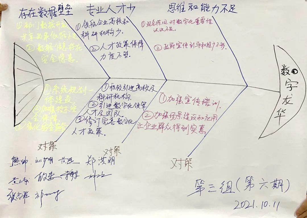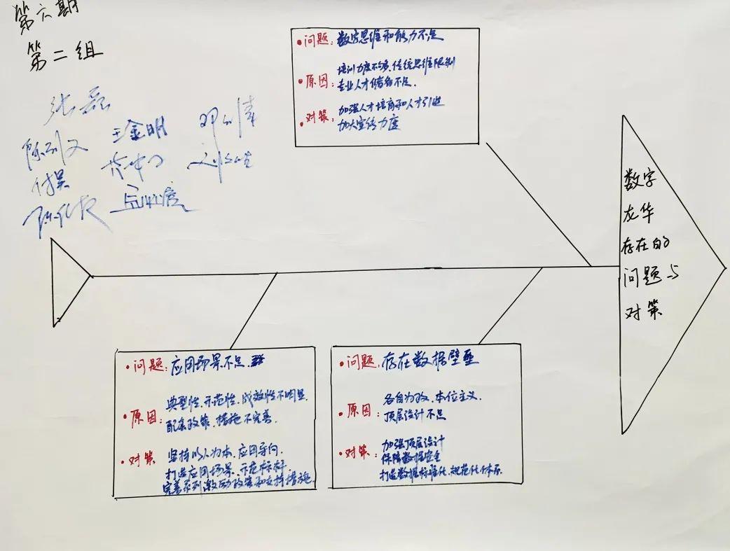 每组学员聚焦议题,开展讨论,深入分析数字龙华发展面临的挑战及其原因,并围绕小组最关注的问题,提出解决办法和对策建议。最后,利用鱼骨图分析法梳理、总结研讨成果。