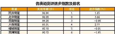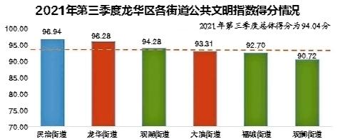 从各街道测评结果来看,民治街道得分相对较高,为96.94分,其次是龙华街道96.28分、观湖街道94.28分、大浪街道93.31分、福城街道92.70分、观澜街道90.72分。