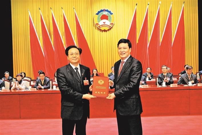 龙华区政协一届一次会议上,时任区委书记余新国向新当选的区政协主席钟荫腾颁发当选证书。