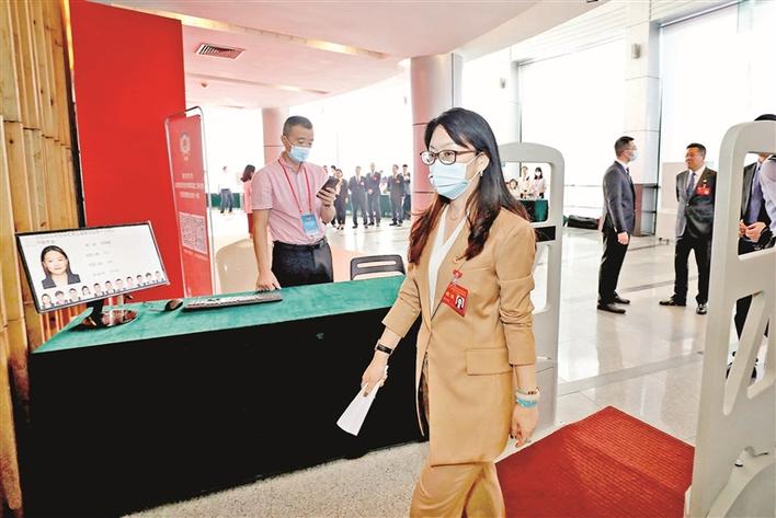 10月16日上午,区政协二届一次会议开幕前,区政协委员罗苏梅走进会场。