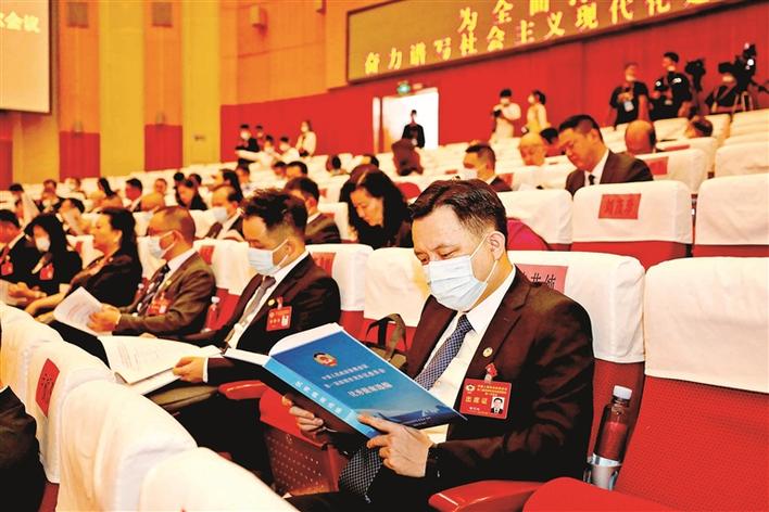 10月16日上午,在区政协二届一次会议开幕大会现场,区政协委员阅读会议材料。