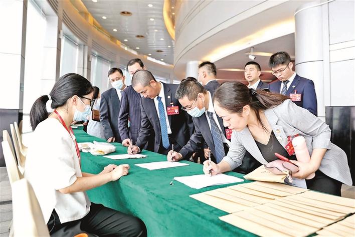 10月16日上午,区政协二届一次会议开幕前,区政协委员在会场签到处签到。