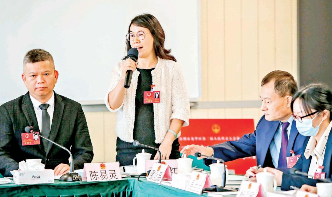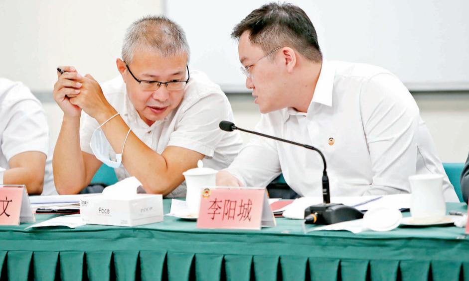 在第六讨论组,委员郭庆文(左)李阳城(右)交流。
