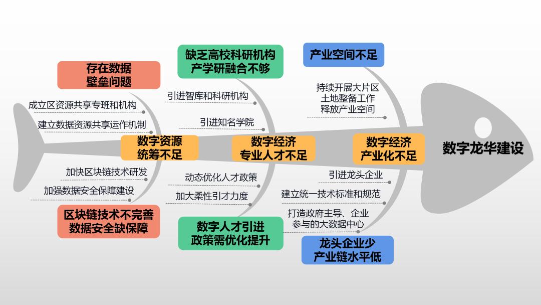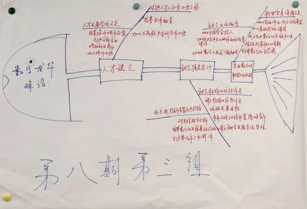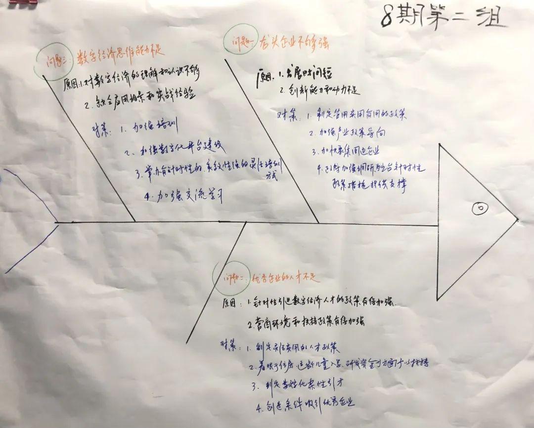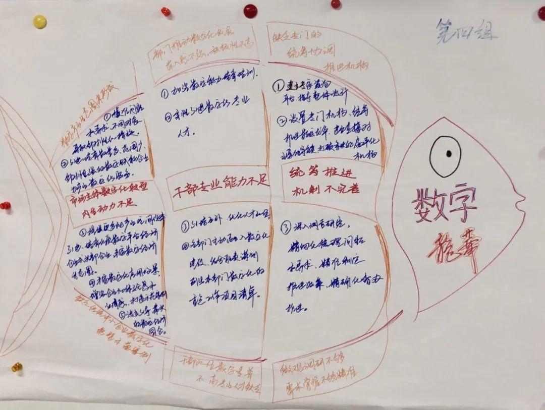 全体学员分成4组,在区委党校以及电子科大(深圳)高等研究院的四位博士(后)催化师的引导下,集思广益,头脑风暴,深入探讨推进数字龙华发展面临的挑战及其原因,并围绕小组最关注的问题,提出解决办法和对策建议。最后,利用鱼骨图分析法梳理、总结研讨成果。