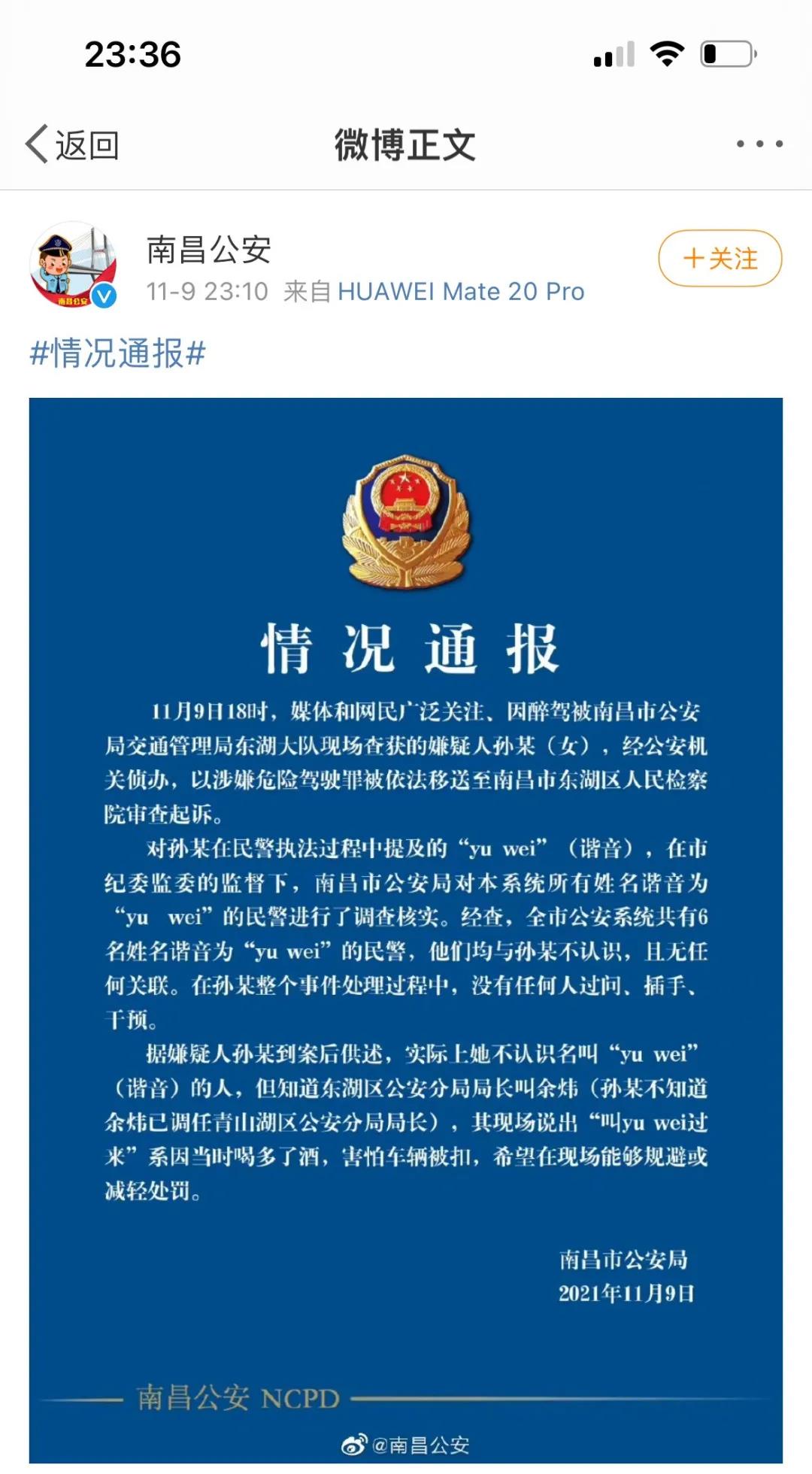 据嫌疑人孙某到案后供述,实际上她不认识名叫“yu wei”(谐音)的人,但知道东湖区公安分局局长叫余炜(孙某不知道余炜已调任青山湖区公安分局局长),其现场说出”叫yu wei过来“系因当时喝多了酒,害怕车辆被扣,希望在现场能够规避或减轻处罚。