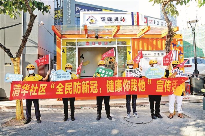 清华社区青创园“暖蜂驿站”启用,骑手们参加防疫、创文宣传。