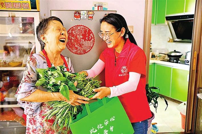 志愿者将采摘下来的爱心蔬菜送到困难家庭手中,居民收到菜后乐开怀。