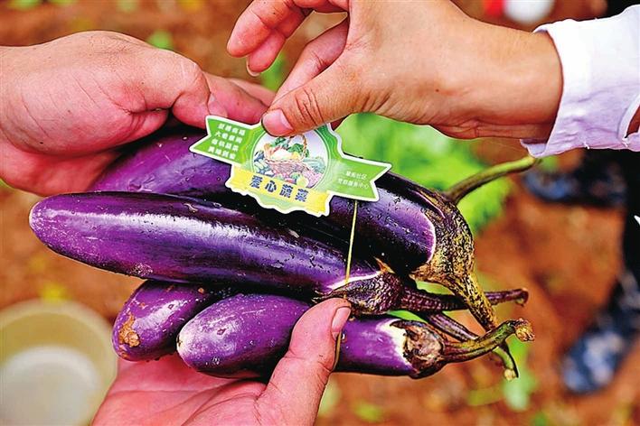 志愿者们将采摘下来的新鲜蔬菜贴上“爱心蔬菜”标签。